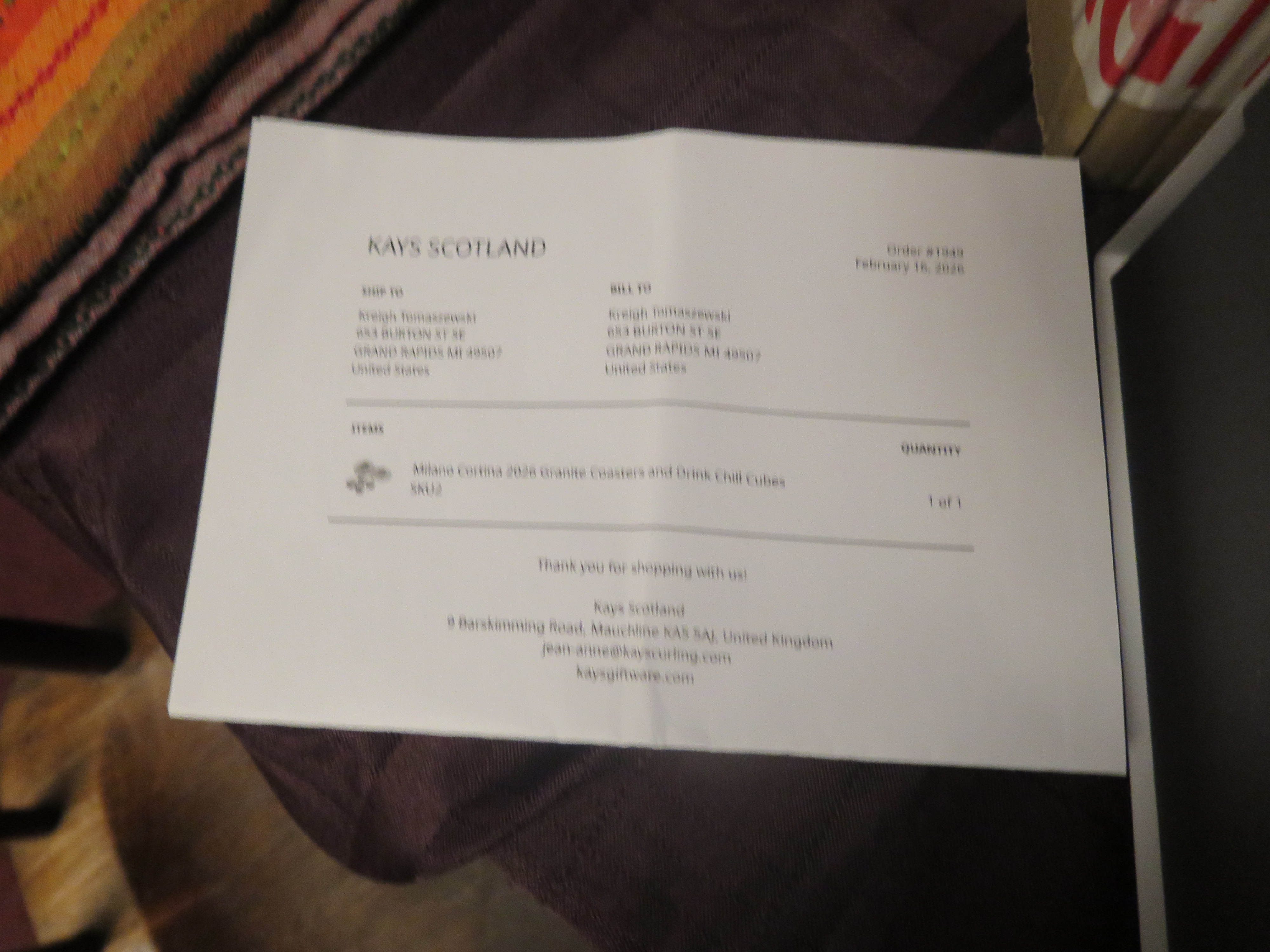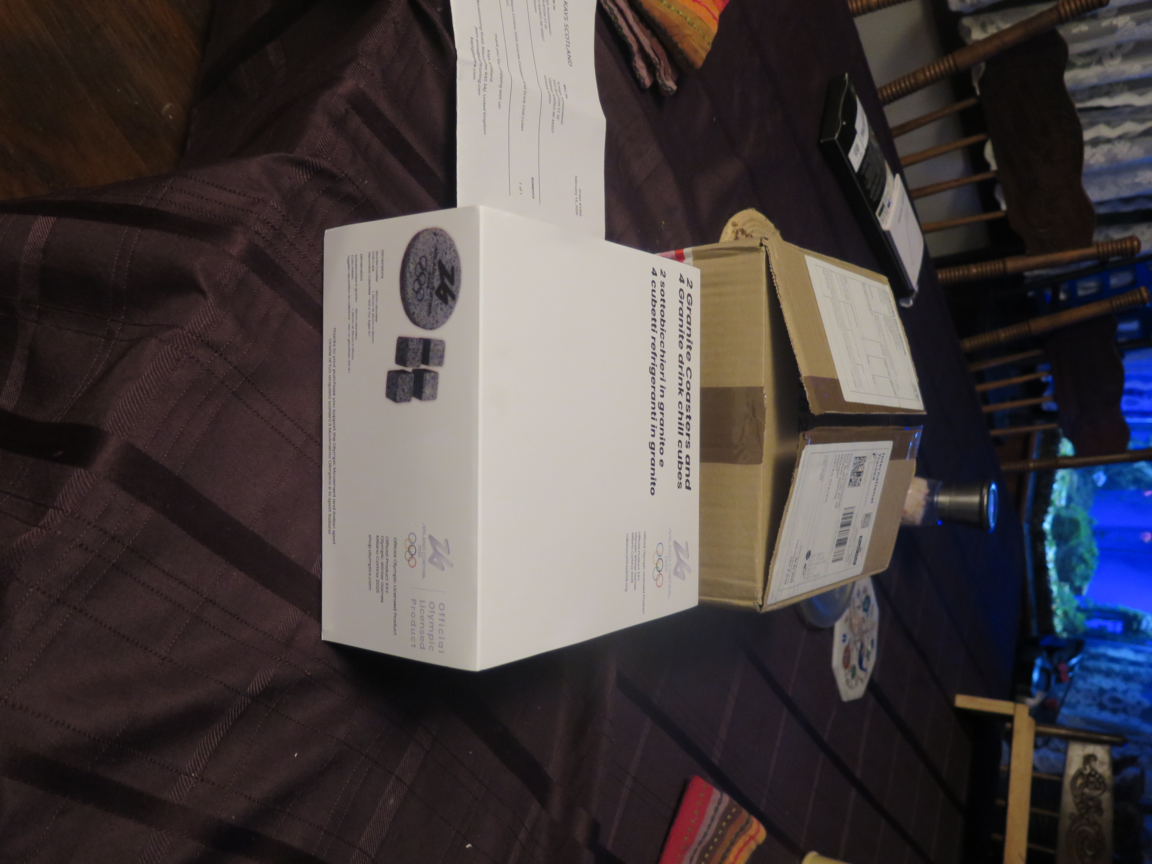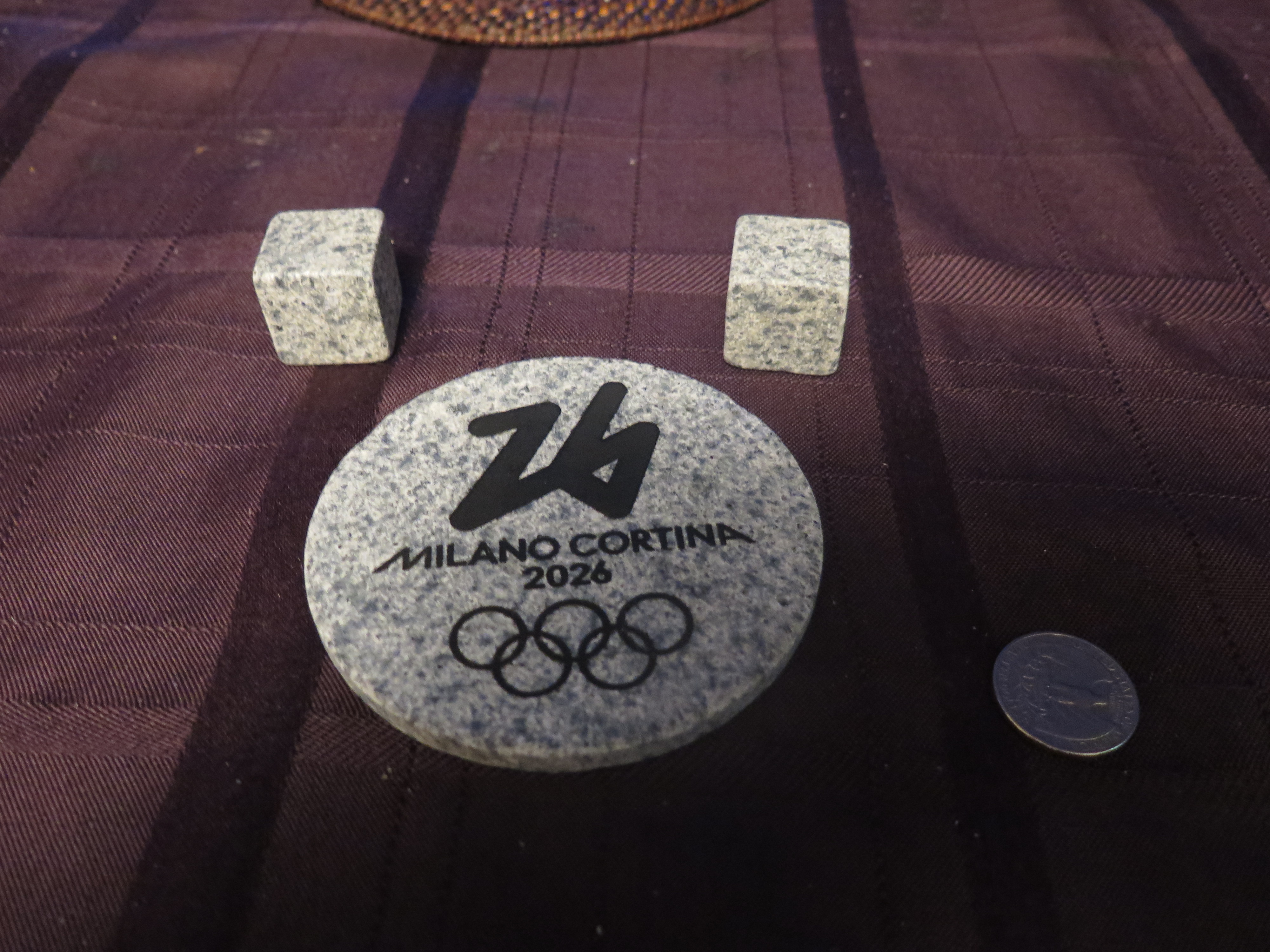 Scottish island, Ailsa Craig located 10 miles off the Ayrshire coast. Island is built mainly of arfvedsonite-aegirine microgranite, which is intruded by basic dikes. The island is famous for production of curling stones because microgranites are particularly tough and take a high polish. The stones were produced and exported from the quarry during 1890s, then closed and reopened in 1961. It proved to be uneconomic and closed again in 1973. Material is now taken occasionally to fulfil orders. Two Milano Cortina 2026 Granite Coasters and Four Drink Chill Cubes (Not made with the Olympic Curling Stones); half the order was donated to the Grand Rapids Public Museum. |